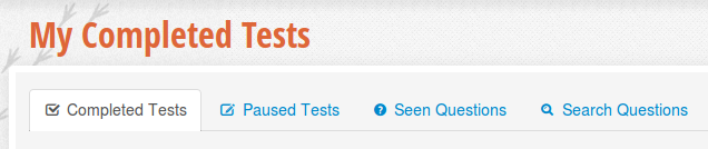 All your tests can be accessed using the My Tests link in the main navigation toolbar (top of every page). This section includes four sub-sections: Completed Tests, Paused Tests, Seen Questions, and Search Questions.