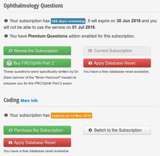 In this example, the user has an active and current subscription to the questions database. Having an active subscription allows you to take tests and review performance in the context of this type of subscription. This way, your results are compared only to those people who also have this type of subscription.