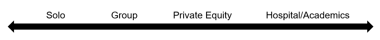 Practice size correlates reasonably well with several key characteristics, mostly due to social and financial reasons, and remains a decent proxy for matching one’s personality and goals to a practice. “Smaller” in this context suggests less than approximately 20 providers. On the contrary, “larger” suggests more than 20 providers, though typical private equity (PE)-owned practices employ well over 40 physicians, and hospital and academic departments can grow to just as large.